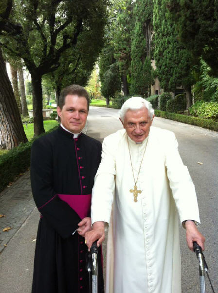Jusqu'à présent, je me suis abstenue de publier les photos de Benoît XVI s'aidant d'un déambulateur pour marcher. Sans doute lui-même souhaitait-il garder cela dans sa sphère privée, puisqu'à chacune des ses apparitions publiques, il a pris soin de marcher simplement en s'aidant d'une canne.