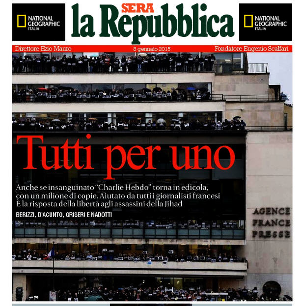 Oui, nous sommes tous ces journalistes tués, nous sommes tous français, comme nous étions, après le 11 Septembre tous américains, et avant encore tous juifs, et après espagnols, britanniques, russes, tibétains, chinois, palestiniens, ukrainiens, et il faudrait consulter la mappemonde pour nous rappeler ce que nous n'avons pas été. Mais aujourd'hui, le cœur est avec Georges Wolinski, Charb, Cabu et ces célèbres caricaturistes «à la vie irrévérencieuse passée à célébrer l'amour et à mettre à nu le pouvoir, ses rituels et ses pièges. Et la puissance du fanatisme, bien sûr, celui que Salman Rushdie appelle le "totalitarisme religieux"», comme l'écrit Ezio Mauro, directeur de la Repubblica, mais comme le répètent plus ou moins avec les mêmes mots, les directeurs et les meilleures signatures de tous les journaux, du Corriere au Manifesto, le dernier des quotidiens communistes resté dans le monde. Peut-être, écrit-il, parce que «l'irrévérencieux Charlie Hebdo est né à la gauche de la gauche» Comme eux, en fait. Jusqu'à Michele Serra (humoriste... de gauche! voirici) qui nous appelle à la «révolte des crayons de couleur»: «Mettez un crayon dans votre poche, les jours prochains, pour vous sentir plus proche de Charlie, même si vous ne l'avez jamais lu, même si vous aimez la satire couci-couça, même si vous la jugez excessive ou grossière ou provocatrice». Tout bien, tout beau, tout sacro-saint, même la rhétorique à la louche est aujourd'hui supportable, parce que l'enjeu n'est pas seulement la satire, mais la liberté même de l'Occident. Même cette vérité évidente (c'est-à-dire tout à fait banale) a été dite et écrite, et c'est tant mieux.