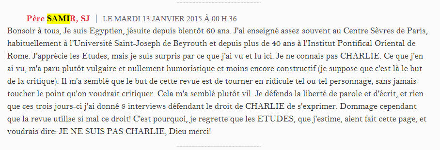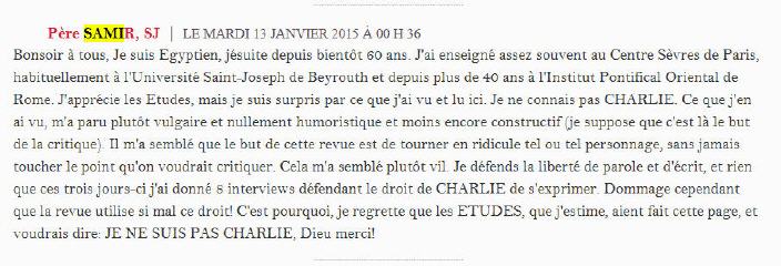 L'islamogue, lui aussi jésuite, avait réagi dans les commentaires de lecteurs suite à la parution du bandeau - aujourd'hui disparu - "je suis Charlie" sur la page d'accueil du site de la revue "Etudes" (15/1/2015)