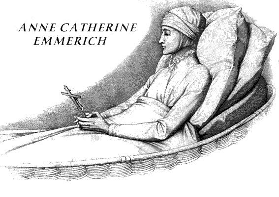 ---S’agissant de l'Eglise, notre bien aimée sainte Catherine de Sienne ne pouvait manquer: Sœur Emmerich déclarait sa dévotion pour elle, en raison aussi du nom qu'elle portait et qui se référait à la sainte de Sienne. Toujours dans cette même vision dont il est question, la bienheureuse raconte: