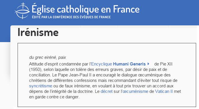 En préambule, voici la définition du mot 'irénisme" donnée sur le site de l'Eglise catholique en France: