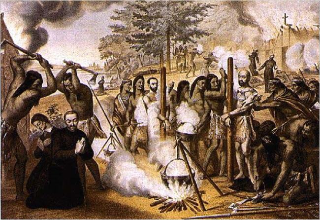 Le Père Isaac Jogues (1607-1646), capturé par les Mohawks, «après un an d'emprisonnement et de torture rentra chez lui tout couturé et avec les doigts d'une main amputés. Mais peu de temps après, il voulut retourner chez ses Indiens».
