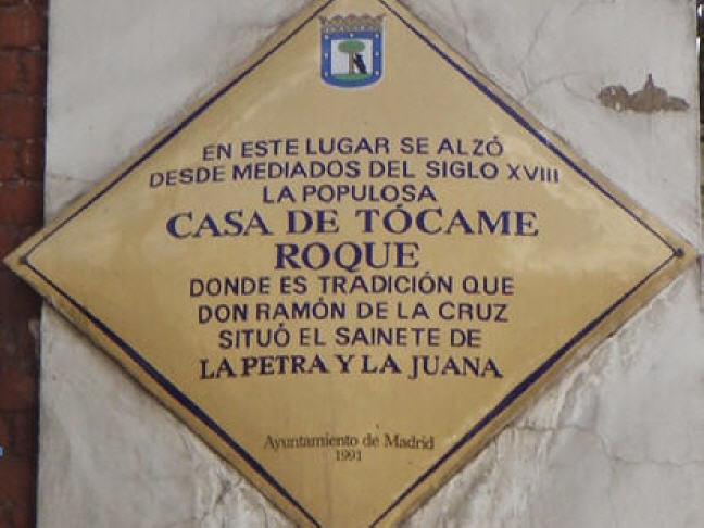 Plaque de l’actuelle rue du « Barquillo » à Madrid, qui précise qu’en ce lieu se dressait à partir de la moitié du XVIIIe siècle la Maison de Tócame Roque où la tradition dit que Ramón de la Cruz (1731-1794) situa sa pièce « La Petra y la Juana ».