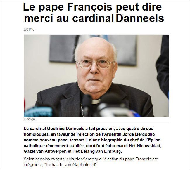 Le Cardinal Bergoglio ne participait pas à aux réunions de la “mafia de Saint-Gall” : l’Argentine est loin de la Suisse ! Mais on ne peut s’empêcher de se demander pourquoi le Cardinal Danneels était-il à côté de lui, sur le balcon, le soir de son élection, alors qu'il ne faisait pas partie de la Curie ? Pourquoi le Pape François crée-t-il cardinal Mgr De Kesel, lequel est une copie conforme du Cardinal Danneels?