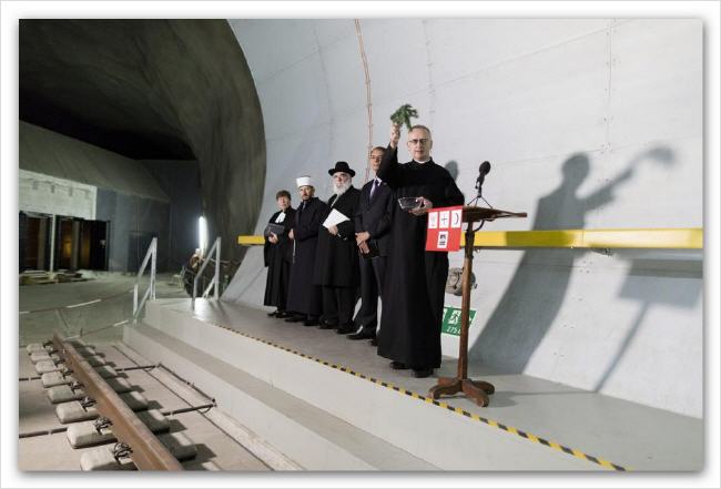 Pendant ce temps, dans un lieu fermé au public, dans une galerie secondaire du tunnel où un tronçon de voie avait été mis provisoirement à disposition, avait lieu une cérémonie religieuse «œcuménique» d'inauguration où officiaient en quelque sorte un abbé bénédictin à la retraite, un pasteur protestant, un rabbin et un imam (dont on a découvert plus tard qu'il avait des positions proches de celles de l'islam radical) (2).
