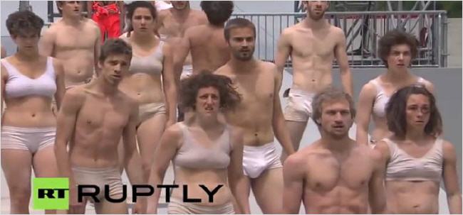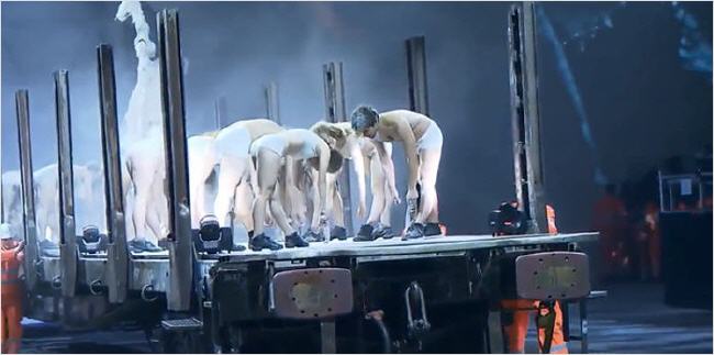 Ensuite, les choses deviennent étranges. Un train amène un groupe de jeunes gens en sous-vêtements blancs, représentant les masses qui emprunteront le tunnel.