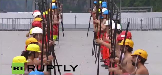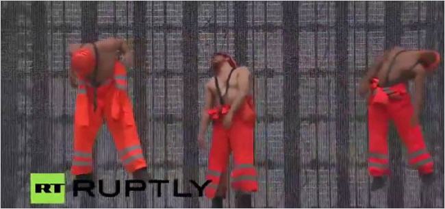 Pour une raison quelconque, les ouvriers enlèvent leur chemise et se mettent en formation militaire.