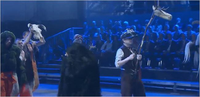 Ensuite, des hommes marchent dans une étrange procession, tenant des crânes cornus comme si c'étaient des objets religieux inestimables.