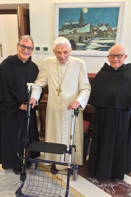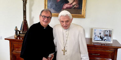 A l'occasion de la bénédiction pascale de l'appartement du Pape émérite Benoît XVI, Mgr Georg Gänswein m'a proposé de m'entretenir à table davec le pape Benoît, suscitant dans mon cœur une grande émotion. Le rendez-vous est pour le mardi 12 Avril à 13h15, quand Mgr Georg quitte habituellement son bureau de préfet de la Maison pontificale. Nous nous sommes rencontrés au portail d'entrée et quelques minutes après, nous avons rejoint le Saint-Père dans son bureau au premier étage, où il y avait aussi quatre memores qui s'occupent de la maison. Le Saint-Père m'a accueilli avec une bonté paternelle et j'ai eu le courage d'adresser aux présents quelques mots de circonstance, avant la distribution et la lecture de la prière de la bénédiction de Pâques. A la fin, le Saint-Père a exprimé sa gratitude pour mes paroles et nous sommes entrés dans la salle à manger, commençant le repas seulement après la prière prononcée par le Saint-Père. Il voulait en apprendre davantage sur les activités paroissiales qui se déroulent, faisant l'éloge de l'engagement apostolique quotidien. Il a également demandé des nouvelles de l'activité particulière des religieux: du Père Stefano Canute à la Congrégation pour les Religieux et du Père Jafet Ramón Ortega en tant que directeur de la Cappella Giulia.