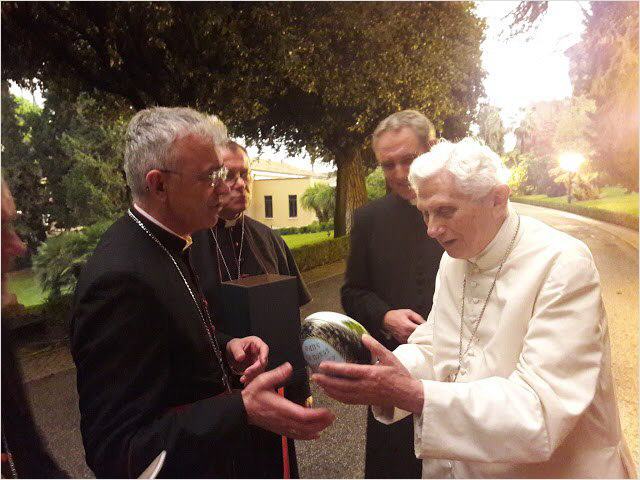 Sur la photo, prise par Mgr Clemens Pickel, Mgr Joseph Werth présente à Benoît XVI le cadeau traditionnel russe - un oeuf de Pâques avec l'inscription en russe: "Au Pape émérite Benoît avec l'amour de la Russie "
