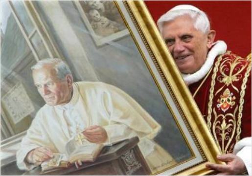 Benoît XVI observe un portrait de Jean-Paul II que lui ont offert les fidèles de Wadowice, la ville natale du saint Pape, en mai 2006.