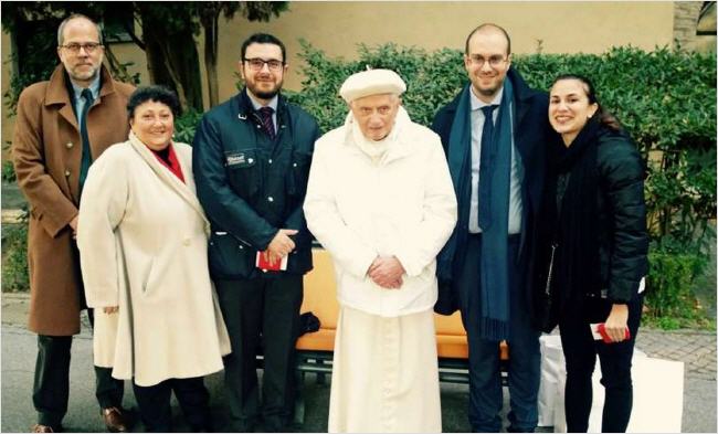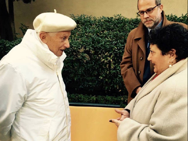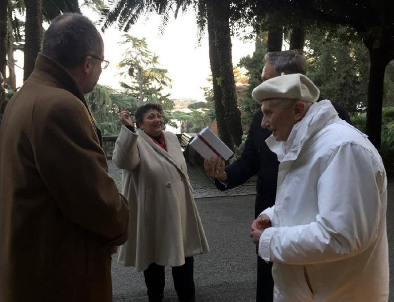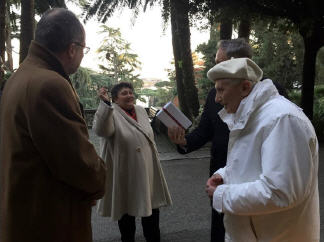 Dans l'après-midi du 15 Décembre, après la prière du Rosaire à la Grotte de Lourdes dans les jardins du Vatican, la directrice, Angela Ambrogetti acompagnée de son mari, d'Andrea Gagliarducci, de Marco Mancini et de Veronica Giacometti sont venus présenter à Benoît XVI leurs souhaits de Noël. Ils parlé du travail du groupe EWTN- Aci, avec un hommage spécial: les articles consacrés à Benoît XVI depuis les débu d'ACI Stampa en mars 2015. Le Pape Émérite a feuilleté avec intérêt le livre contenant les textes.