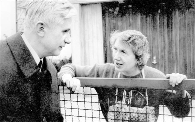 Une discussion à la porte du jardin. À la maison en Pentling Maria Ratzinger s'occupe du ménage de son frère Joseph, mais c'est lui qui sort la poubelle (Photo: Horst Hanske)