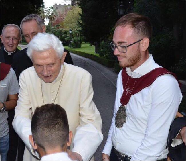 Entré par la porte Sainte-Anne, au fur et à mesure que j'avançais dans les jardins du Vatican, en direction de la grotte de Lourdes, je vis quelque chose de blanc, au fond, qui apparaissait entre les feuilles des arbres. Me rapprochant, je m'aperçus que ce "quelque chose" en réalité, était un "quelqu'un": Benoît XVI, sereinement assis sur un simple banc, avec en main son chapelet, en train de réciter son Saint-Rosaire habituel. Il était là, le regard fixé sur l'icône de la Vierge, visage contre visage, tellement absorbé par l'intense prière qu'il semblait que rien ni personne ne pût lui faire détacher ses yeux d'elle. La prière du Rosaire achevée, le cher Mgr Gänswein, d'un signe, nous invita à venir vers le Saint-Père. Avec nous, les jeunes, il y avait notre curé don Pino, en notre archevêque Mgr Gristina, l'ami "paternel" Mgr Sciacca et deux autres prêtres.