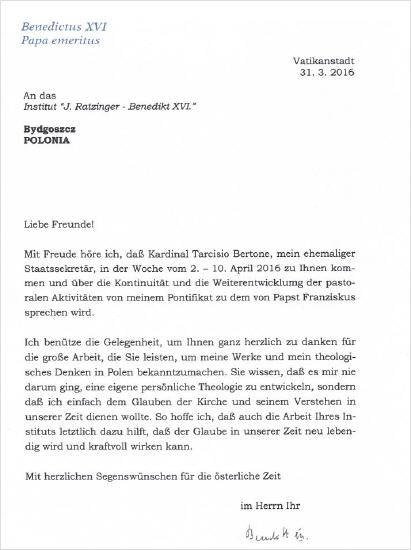 Je profite de cette occasion pour vous remercier de tout coeur pour l'excellent travail que vous accomplissez pour faire connaître en Pologne mes travaux et ma pensée théologique. Vous savez que je n'ai jamais voulu développer une théologie qui me soit propre, mais que j'ai voulu simplement servir la foi et la compréhension de l'Eglise en notre temps. Et ainsi, j'espère qu'en fin de compte, les activités de votre institut serviront elles aussi à revitaliser la foi de nos jours et à contribuer à sa grande efficacité.