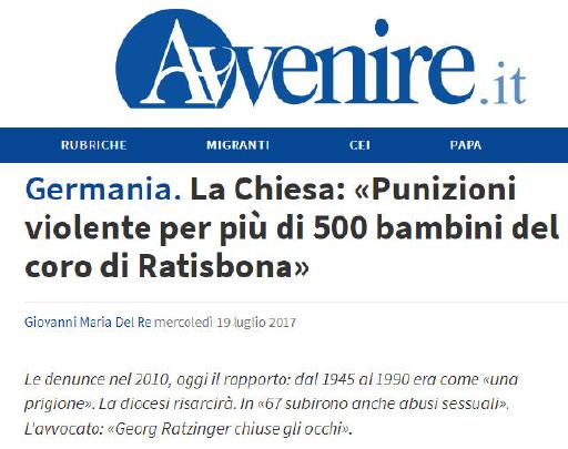Eh oui ... L'école en cause était en effet l'une de celles où étudiaient les membres du Regensburger Domspatzen, célèbre chœur de voix blanches que dirigeait à l'époque Georg Ratzinger, frère du pape émérite. Ce dernier n'a jamais été effleuré par l'accusation d'abus sexuels. D'après les témoignages qu'on peut lire dans le rapport final, il ressort que certains élèves se souviennent de lui avec des appréciations positive et parfois avec affection et d'autres en évoquent surtout le caractère bourru qui le conduisait parfois à lâcher une gifle. Il y a aussi des passages qui font franchement sourire, comme l'anecdote dans laquelle, tandis que le professeur crie, furieux, son dentier tombe ... Pour les corrections, qui encore une fois sont typiques des méthodes pédagogiques de «dans le temps» le vieux prêtre a présenté des excuses il y a sept ans, juste après les premières plaintes. En résumé, il s'agit vraiment de pas grand'chose.