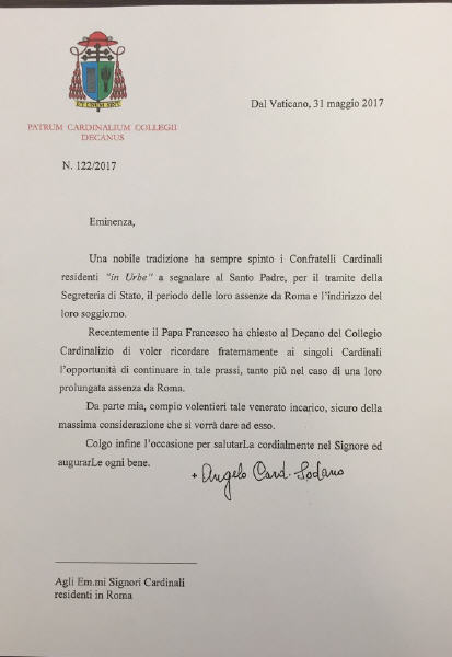 Cette lettre envoyée par le doyen du collège des cardinaux aux cardinaux "résidents", c'est-à-dire ceux qui résident à Rome, a été révélée aujourd'hui par le correspondant à Rome du Wall Street Journal, Francis X. Rocca.
