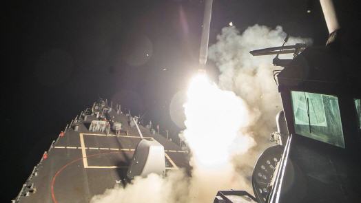 Lancement de missiles Tomahawk depuis le destroyer USS Ross en mer Méditerranée, le 7 avril 2017 (image US. Navy)