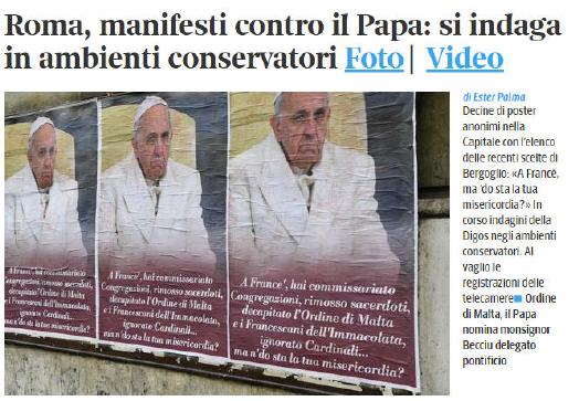 En un clin d'oeil, la photo est devenue "virale" sur les réseaux sociaux et les blogs, elle en a fait rire certains, mais elle a suscité de la part des vertueux papistes (les "thuriféraires") une réprobation indignée pour ce crime de lèse-majesté. Les grands médias du système ont immédiatement titré sur la responsabilité des méchants "ultraconservateurs". Par exemple, le Corriere della Sera titre "ON ENQUÊTE DANS LES MILIEUX CONSERVATEURS".