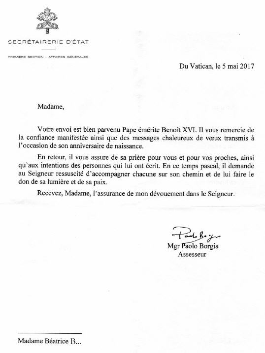 Voici la réponse que j'ai reçue... sous une simple enveloppe banalisée portant le cachet d'un bureau de poste du XVe arrondissement parisien (21/5/2017)