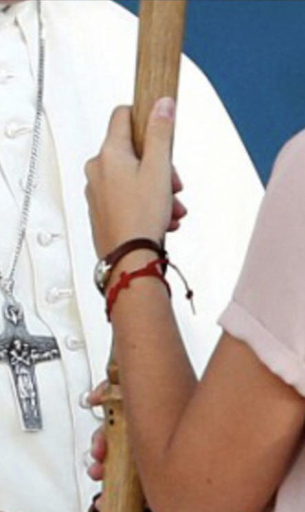 Dans son blog, son père John Zuhlsdorf, qui ne les envoie jamais dire, montre la photo qui représente le moment où la férule a été donnée au pape par une jeune fille, lors de la rencontre au Cirque Maximus. En plus des cornes en haut du bâton, le Père John se concentre sur le bras gauche de la fille et en particulier sur son poignet, où l'on voit un bracelet rouge. D'après le père John, c'est un symbole Wiccan.