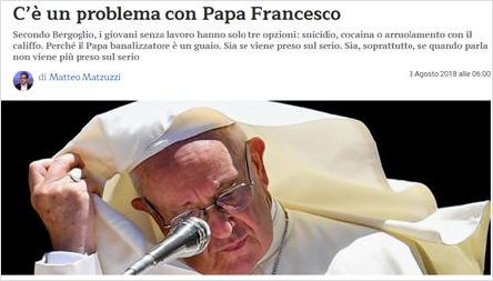 «Selon Bergoglio, les jeunes chômeurs n'ont que trois options : le suicide, la cocaïne ou l'enrôlement avec le calife. Pourquoi le pape banalisateur est un problème. Qu'il soit pris au sérieux, ou, surtout qu'il nne soit plus pris au sérieux lorsqu'il parle».