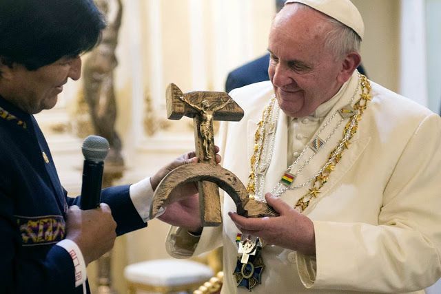 On se souvient surtout de l'incroyable cadeau reçu (et accepté) du dictateur bolivien Morales, durant l'été 2015: un crucifix réalisé avec une faucille et un marteau...!