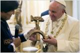 Notons par ailleurs que le Pape (qui n'est évidemment pas responsable des cadeaux qu'on lui fait, au moins directement), est connu pour être friand des objets détournés et recyclés (une concession à ses convictions écologiques, peut-être). On se souvient de la férule papale "faite du bois des barques de réfugiés", "de l’autel, lui-même construit avec les restes d’une de ces barques de fortune qu’on peut encore voir échouées au fond du port de Lampedusa" (www.la-croix.com) lors de son déplacement à Lampedusa en juillet 2013.