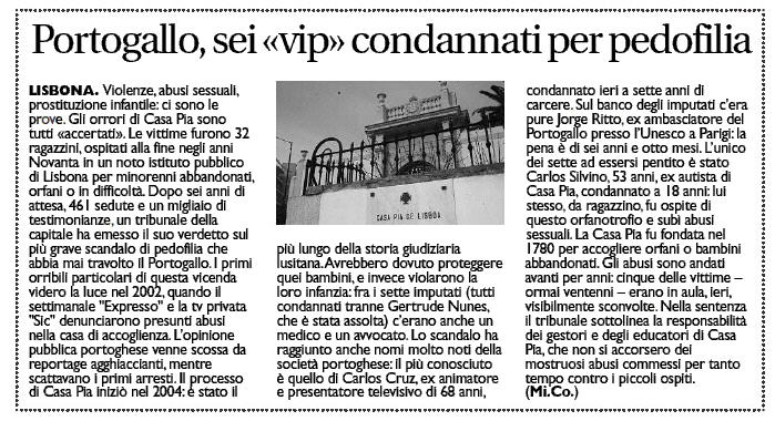 Vendredi 3 Septembre dernier, EuroNews informait de la condamnation de six "VIP" Portugais, accusés à la fin des années 80 d'abus sexuels sur des mineurs logés dans la Casa Pia , un ancien orphelinat public de Lisbonne . Eh bien, pensai-je, demain, je lirai dans les journaux les détails de l'histoire .