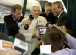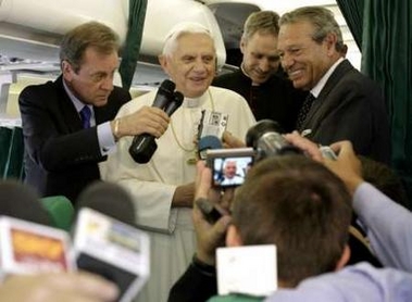 Durant le voyage de Benoît XVI à Sao-Polo et Aparecida, je voyagerai une fois de plus dans l'avion du pape. Comme on me pose souvent des questions sur cette expérience, je vais vous en faire un récit. Tout d'abord, les américains qui conçoivent "l'avion du pape" au moyen d'une analogie avec 'Air Force One' sont sur une fausse piste, même s'il arrive que les contrôleurs aériens le désignent sous le nom de 'Shepherd One'. (berger 1) En fait, il n'y a pas "d'avion du pape", au sens d'un jet qui appartiendrait au Vatican, et qui serait utilisé exclusivement pour les voyages du pape. Au lieu de cela, un avion commercial régulier de la compagnie Alitalia est réservé pour le jour du voyage du pape. Le pilote et le personnel sont tous des employés ordinaires de Alitalia. Le jour suivant, l'avion retourne à son service habituel, avec des passagers ignorant probablement qu'ils sont assis dans ce qui venait d'être "l'avion du pape". Il n'y a pas de pièce réservée au pape, avec lit, télévision, bureau, télévision et bar. Le seul avantage est qu'un siège lui est réservé sur la rangée de devant. Derrière lui prennent les personnalités officielles les plus éminentes du sécrétairiat d'Etat, à commencer par le Cardinal Tarcisio Bertone. Cet arrangement signifie que lorsque le personnel de bord s'installe pour débarasser, il est directement en face du Saint-Père: les observer alors qu'ils s'efforcent de ne pas le regarder est un des passe-temps favoris à bord.