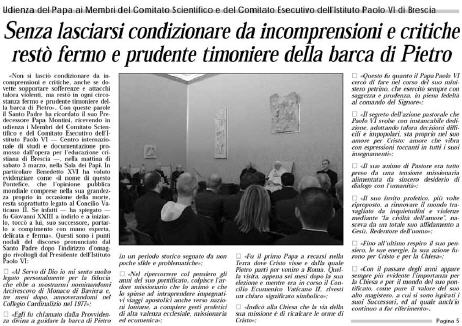 "Sans se laisser conditionner par les incompréhensions et les critiques, il demeura le timonnier ferme et prudent de la barque de Pierre". ----------------------- Udienza del Papa ai Membri del Comitato Scientifico e del Comitato Esecutivo dell'Istituto Paolo VI di Brescia