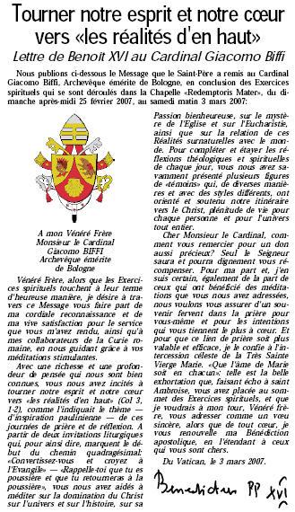 La lettre publiée en première page de l'Osservatore Romano (édition en français du 4 mars) complète les paroles adressées verbalement par Benoît XVI au Cardinal, après la dernière méditation: je ne résiste pas au plaisir de la citer en entier, car, plus que le discours formel reproduit sur l'organe officiel du Vatican, elle le décrit bien, dans sa spontanéité et son humour (voir l'anecdote sur la gouvernante du Cardinal), comme à chaque fois qu'il s'exprime plus ou moins sans notes. L'idée que l'on pourrait voler si l'on parvenait à s'arracher "à la pesanteur du matériel" est un thème que j'ai plusieurs vu développé par lui, et qui lui plaît - voir l'anecdote racontée par A. Borghese, à propos de Sainte Scholastique (ici) . J'ai à ce propos en mémoire une émission diffusée sur Arte, peu après l'élection (intitulée itinéraire d'un Pape) où il l'illustrait, en quelque sorte, d'un geste aérien de ses doigts de pianiste.(source: Vatican)