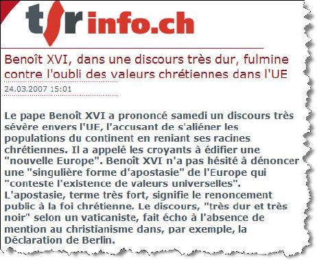 Il s'adressait ce samedi 24 mars aux évêques de la commission épiscopale de la communauté européenne, lors d'une audience à l'occasion des 50 ans du traité de Rome. Il les a fermement rappelés à leur devoir d'intervenir dans le débat politique: ''Voi sapete che avete il compito di contribuire a edificare con l'aiuto di Dio una nuova Europa, realistica ma non cinica, ricca d'ideali e libera di ingenue illusioni, ispirata alla perenne verita' del Vangelo'' (Vous savez que vous avez le devoir de contribuer à édifier, avec l'aide de Dieu, une nouvelle Europe, réaliste, et non pas inique, riches d'idéaux, mais libre d'illusions naïves, inspirée par les sources éternelles de l'Evangile.)