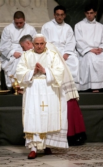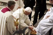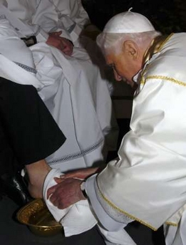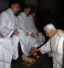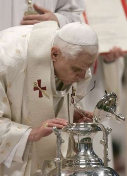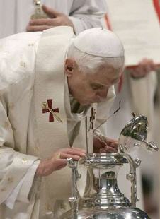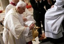 Extrait de l'homélie: --------------------------------- C'est cette cène aux multiples significations que Jésus célébra avec les siens le soir avant sa Passion. Sur la base de ce contexte nous devons comprendre la nouvelle Pâque, qu'Il nous a donnée dans la Sainte Eucharistie. Dans les récits des évangélistes il existe une contradiction apparente entre l'Evangile de Jean, d'une part, et ce que, de l'autre, nous communiquent Matthieu, Marc et Luc. Selon Jean, Jésus mourut sur la croix précisément au moment où, dans le temple, étaient immolés les agneaux pascals. Sa mort et le sacrifice des agneaux coïncidèrent. Cela signifie cependant qu'Il mourut la veille de Pâques et qu'il ne put donc pas célébrer personnellement la cène pascale — c'est tout au moins ce qu'il semble. En revanche, selon les trois Evangiles synoptiques, la Dernière Cène de Jésus fut une cène pascale. Dans la forme traditionnelle de cette cène il a inséré la nouveauté du don de son corps et de son sang. Cette contradiction semblait insoluble jusqu'il y a quelques années encore. La plupart des exégètes était de l'avis que Jean n'avait pas voulu nous communiquer la véritable date historique de la mort de Jésus, mais avait choisi une date symbolique pour rendre ainsi évidente la vérité la plus profonde: Jésus était le nouvel et véritable agneau qui a répandu son sang pour nous tous.