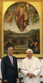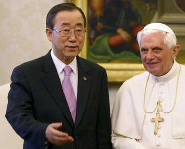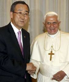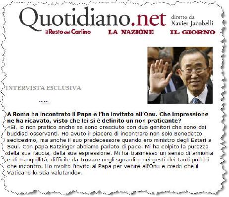 Le Secrétaire Général de l'ONU, Ban Ki-Moon, a rencontré le Pape à Rome le 18 avril dernier. Il vient juste de donner (24 avril) une interview au journal "Il Quotidiano italiano": Voir ici: http://qn.quotidiano.net/ (information dénichée grâce au Papa Ratzinger Forum)