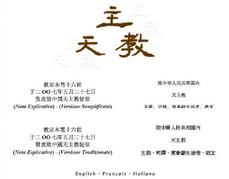 Dans le texte, apparaissent deux idées fondamentales: d’un côté, une profonde affection pour toute la communauté catholique en Chine et, d’un autre, une fidélité passionnée pour les grandes valeurs de la tradition catholique dans le domaine ecclésiologique; une passion donc pour la charité et pour la vérité. Le Pape rappelle les grandes lignes ecclésiologiques du Concile Vatican II et de la tradition catholique, mais en même temps il prend en considération des aspects particuliers de la vie de l’Église en Chine, les situant dans une large vision théologique. .... -------------------------------------------------------------------- Sur l'Eglise "qui est en Chine", voir ici: L'Eglise de Chine