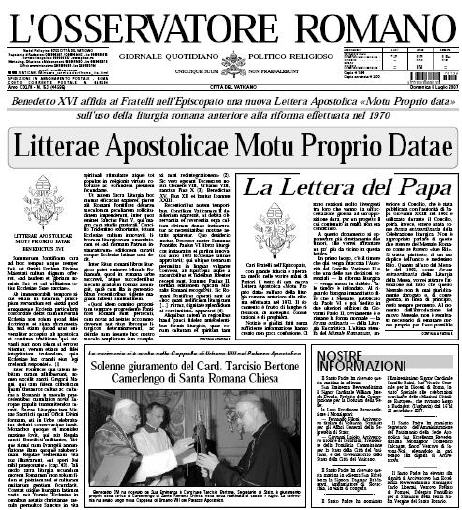 MOTU PROPRIO: LA "UNE" DE L'OSSERVATORE ROMANO
