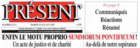 Il me plaît de reproduire ici les articles lus dans "Présent" du 10 juillet 2007 (que j'ai acheté spécialement pour l'occasaion). Il ne s'agit pas d'un chant de victoire, mais d'un cri de joie. Quoiqu'on pense par ailleurs, ce sont eux qui sont en priorité concernés par ce texte, et ils ont su le recevoir comme ils le devaient. Nous dirons donc, au moins, qu'ils ne sont pas ingrats. Et leur "merci, très Saint-Père" me fait chaud au coeur.