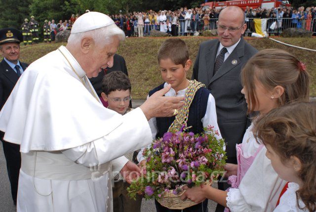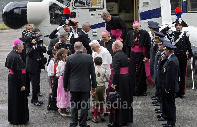 La porte du "Falcon" qui l'a amené de Rome à Trévise s'ouvre: il en sort une quantité de gens. ... Après un instant de suspens, la silhouette blanche apparaît, et descend, sans s'accorder ces quelques secondes que, d'habitude, les politiciens mettent à profit pour faire éclater les applaudissements. "Mais qui est cet homme vêtu de blanc aux côtés de Galan?", plaisante un photagraphe tout en mitraillant. En réalité Giancarlo Galan, le président de la Région Vénétie, a un physique imposant, et dans le groupe qui attend au pied de l'avion , le Pape est resté derrière, caché aux objectifs. D'ailleurs, c'est ce qu'il veut: rien de formel, pas de protocole. Benoît XVI est "en transit", dans l'aéroport militaire d'Istrana, et devrait descendre de l'avion et monter dans un hélicoptère, afin de rejoindre Lorenzago de Cadore, pour quelques jours de congé, en restant fidèle aux habitude de Jean-Paul II. Pas aussi communicatif, 80 ans mais le pas vif et l'air assuré, Papa Ratzinger met ses pas dans ceux du Pontife dont la souffrance était devenue symbole pour tous, les croyants et les non-croyants, les catholiques et les autres. Jean-Paul II s'est fait aimer aussi des athées et des musulmans, mais il n'en sera pas de même avec Papa Ratzinger, pour son caractère d'acier et pour ses yeux de faucon. ... Un enfant blond de 8 ans, fils du commandant d'Istrana, apporte un bouquet de fleurs au Pape, et comme sa maman est allemande, il salue en allemand. Le Pape, en allemand, lui demande son nom - Ludovico Biavati - lui fait une caresse et le remercie. Ensuite il salue les "personnalités" qui l'ont accueilli au bas de l'avion et va, tout doucement, vers l'hélicoptère. Sur le parcours, il y a beaucoup de gens, agglutinés sur les barrières, dont il s'approche. Des religieuses, des malades, des personnes en fauteuil roulant, jeunes et vieux lui tendent les mains, et il les touche, les salue, s'arrête un instant puis continue son chemin vers l'hélicoptère. Étrangement mais intelligemment, aéroport militaire oui, mais ouvert. Sans faire d'annonce, ceux qui en ont fait la demande ont été admis, simplement.