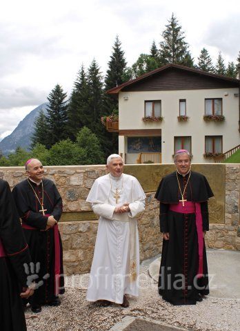 Je vous suis très reconnaissant, ainsi qu'aux Autorités Citadines et à l'entière Communauté de Lorenzago de Cadore pour l'accueil qui m'a été réservé à l'arrivée dans cette belle localité entourée de très beaux bois et des majesteuses montagnes des Dolomites. Je remercie, en particulier, pour les souhaits pour une fructueuse période de repos, très appréciés car renforcés par les prières sur lesquelles je compte beaucoup pour accomplir la mission qui le Seigneur m'a confiée. J'ai été informé de l'initiative d'honorer Saint-Benoît, patron de l'Europe, pour le jour de sa fête, avec un concert d'orgue et avec la présentation de l'exposition dédiée aux "Trésors de l'art dans les églises du Haut-Bellunese", qui aura lieu ce soir dans l'Église paroissiale. Un remerciement particulier au Maestro José Luis González Uriol pour le concert au cours duquel il jouera de l'orgue - roi des instruments musicaux- tout juste restauré, et aux membres la Schola Cantorum de Lorenzago parce que, comme le rappelle Saint-Augustin, "celui qui chante prie deux fois". En assurant de ma participation spirituelle à l'évènement, il m'est à coeur d'apporter à toutes les personnes présentes et à l'entière Communauté mon cordial et affectueux salut, accompagné d'un souvenir spécial au Seigneur en cette veille de la fête de SS. Patrons Ermagora et Fortunato. Avec ma Bénédiction.