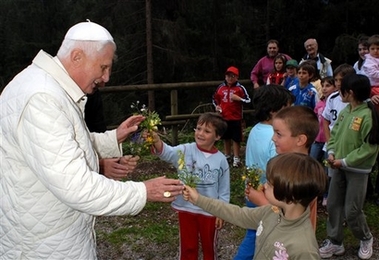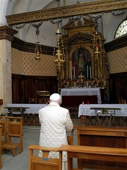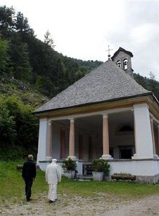 Rosaire à huis-clos ------------------------------ FRANCESCO DAL MAS LORENZAGO. Il a vraiment raison l'évêque Giuseppe Andrich : la maison lui semble étroite, à papa Benedetto , il a même envie d'en sortir, pour rencontrer les gens. Benoît XVI est sorti du Mirabello pour s'approcher des premières maisons du village, le long de la via Pecol. C'est la route des courts de tennis. Après quoi il est remonté en voiture, et a traversé le pays en traversant la via Roma. Hier soir, à la même heure, le pape était déjà sorti. Non pas pour se promener, comme il a l'avait fait durant la journée dans le jardin et dans le "parc des rêves", mais pour aller à Lozzo de Cadore, au sanctuaire marial de la Madonna de Loreto, du XVII-ème siècle. Il s'est arrêté dans l'église et a récité le rosaire. À huis-clos, avec ses collaborateurs. À l'extérieur, une petite foule de résidents et de vacanciers s'était rassemblée,avec des enfants, prêts à lui offrir des bouquets de fleurs. Beaucoup pensaient qu'après la prière, le pape et ses accompagnateurs se seraient promenés le long de la route romaine, ancien itinéraire qui mène de Lozzo à Auronzo.