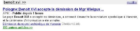 Au moment où j'écris ces lignes (dimanche 7 janvier, 14 heures, fête du baptême du Seigneur...), il y a pas moins de 191 articles traitant de cette question, sur la page d'accueil des actualités de Google (et leur nombre semble croître de minute en minute!). A comparer avec la très modeste couverture habituelle de l'"actualité pontificale", constituée essentiellement par les beaux articles du site ESM...
