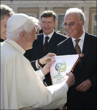 Comme président du Comité d'organisation de la Coupe du Monde 2006, Beckenbauer a rencontré le Saint-Père au Vatican en octobre 2005. Cette rencontre a fait une profonde impression sur l'athlète allemand qui, après le voyage du Pape en Bavière en 2006, s'est plongé dans les écrits du Saint-Père. Le résultat de ces lectures est que Beckenbauer est revenu à une pratique active de sa foi. "Benoît XVI conduit les gens vers l'Eglise" a-t'il dit "et j'en suis le meilleur exemple". Connu sous le nom de "kayser" à cause de sa maîtrise du jeu, Beckenbauer fut capitaine de l'équipe d'Allemagne qui gagna la coupe du monde en 1974.