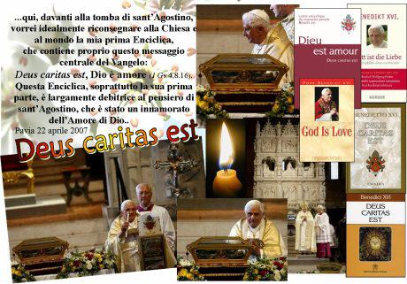Ici, devant la tiombe de Saint-Auguster, idéalement, je voudrais à nouveau conseiller au monde ma première encyclique, qui contient précisément le message central de l'Evangile: Deus caritas Est. Cette encyclique, surtout dans sa première partie, est largement débitrice de la pensée de Saint-Augustin, qui a été un amoureux de l'amour de Dieu.