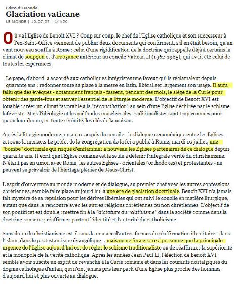 Celle du Monde, qui commente dans son éditorial du 10 juillet les deux dernières manifestations d'autorité papale (motu proprio, et document de la CDF ), en des termes lourds de rancoeur. C'est très bon signe. Quand l'éditorialiste du Monde (qui ne signe pas de son patronyme) se mêle d'apprendre au Pape à faire le Pape, on peut quand même se permettre un sourire amusé. Le dépit est toujours mauvais conseiller.... Article sur le site du journal ici: Glaciation vaticane. On aprréciera le titre, qui donne bien le ton de l'article.