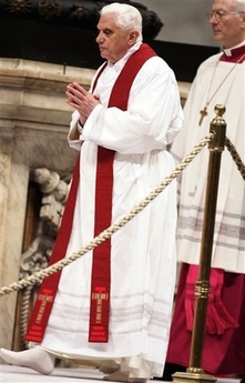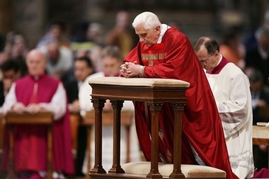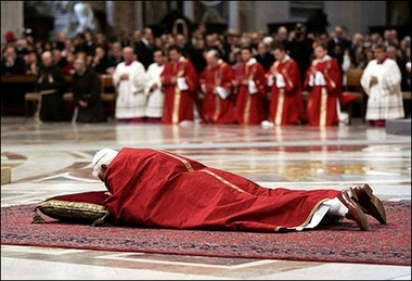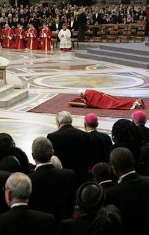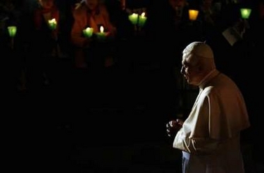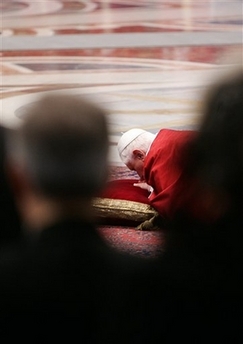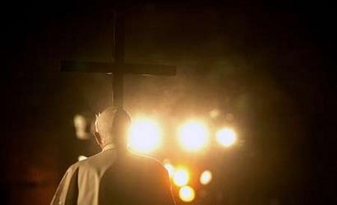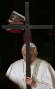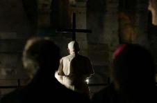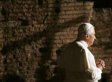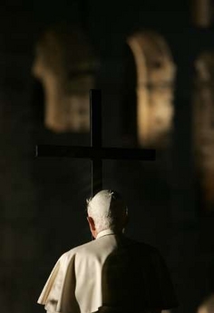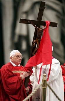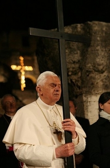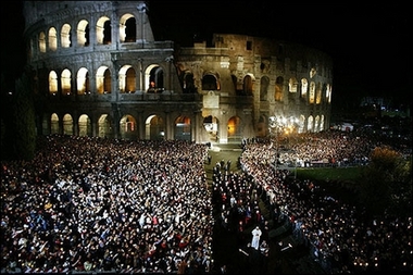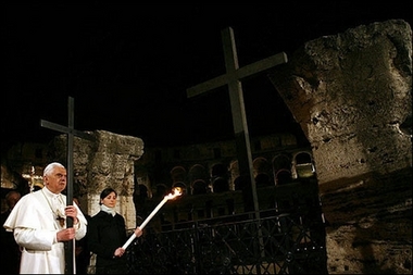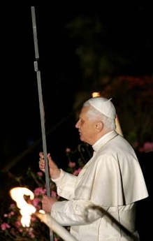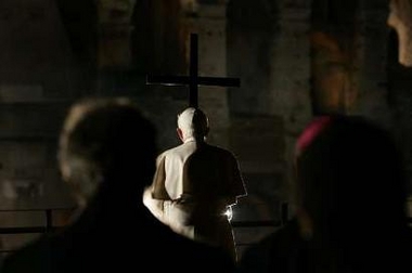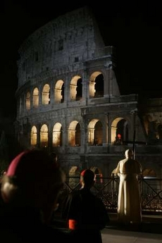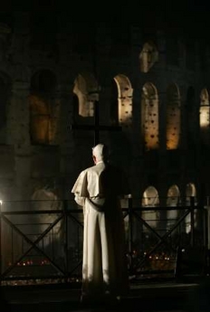 AGI, 6 avril 2007 (traduction) ------------------------------------ Avec une présence massive et une chaleur extraordinaire, les fidèles ont récompensé Benoît XVI, qui, à la veille désormais de son 80ème anniversaire, ne s'est soustrait à aucun des gestes rituels de la liturgie du Tridum Pascal: hier, il a lavé et essuyé les pieds de douze fidèles dans la Basilique Saint-Jean de Latran, cet après-midi, à Saint-Pierre, il s'est prosterné à terre, sur un tapis rouge, pour l'adoration de la Croix, et ce soir, à la quatorzième station du Chemin de Croix, il a porté la Croix, pour monter jusqu'à la terrasse du Palatin. Les images suggestives du Colisée illuminé par les milliers de petites flammes portées par les fidèles et l'émotion visible sur le visage du Pape se sont reflétées dans les yeux des enfants africains et européens représentant les différents continents, qui suivaient la Croix.
