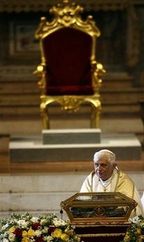 A propos de la visite de Benoît à Pavie, sur les traces de son "ami" Augustin, on lira l'excellent article d'Isabelle de Gaulmyn dans LA CROIX: Benoit XVI, pape augustinien Et cet autre, plus discutable, écrit après la visite: Saint-Augustin, modèle pour l'Eglise On peut s'étonner que l'envoyée spéciale de La Croix y ait cru bon de s'interroger sur la réaction des fidèles à l'homélie de dimanche matin: 'Auront-ils apprécié la leçon austère et quasi académique de l’homélie sur saint Augustin que leur a tenue Benoît XVI ?' Lire ici: Homélie à Pavie Et aussi: Benoît XVI et Saint-Augustin