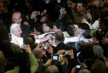 Une quantité de photos, parmi lesquelles il était trop dur de "tailler"! Gentil, disponible, malicieux, souriant, rayonnant, même. Chacun de ses gestes est chargé d'une profonde bienveillance... Aujourd'hui encore, dans l'Aula Paul VI, archi-comble (il y avait au moins 9000 personnes), l'ambiance était au triomphe. Avec sa modestie coutumière, il n'est pas tout à fait parvenu à faire taire les acclamations. Juste avant la bénédiction finale, les pélerins italiens, debout, scandaient, bras levés: "TI VOGLIAMO BENE!" (nous t'aimons). Pour susciter ces cris d'enthousiasme, il n'a besoin que d'être lui-même. Personne n'en parle jamais, c'est pourquoi je crois nécessaire de le faire savoir dans notre pays, où l'on ne parle jamais de lui, justement, sauf pour le critiquer. "Ils" ne le montrent pas, car on pourrait bien s'apercevoir, après tout, non pas qu'il est médiatique, comme ils disent (s'il s'incarnait, le diable lui-même le serait probablement), mais qu'il est simplement sublime. Voir video
