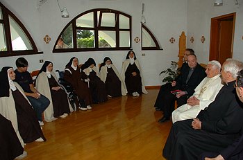 Les religieuses cloîtrées ont été définies comme "précieux" signe que "Dieu existe", "oasis spirituel dans le désert d'aujourd'hui". Papa Ratzinger n'a pas caché aux soeurs sa préoccupation pour l'incessante émigration des chrétiens de Terre Sainte. "Les chrétiens, a-t'il dit, sont en difficulté". Initialement, la rencontre ne devait pas durer plus d'une demi-heure, et au contraire, elle s'est prolongée plus d'une heure. Après le discours, Papa Ratzinger mettant de côté l'aspect officiel, s'est entretenu aimablement avec chacune des religieuses. "Nous lui avons parlé de Jean-Paul II, lui racontant que, deux ans plus tôt, il était venu nous voir. Ce fut la dernière visite à ce cloître. Benoît XVI a eu une expression pleine d'émotion. Jean-Paul II était trés attiré par la spiritualité des carmélites, et alors, le Pape a dit "Moi aussi, j'aime le Carmel" (voglio molto bene al Carmelo).