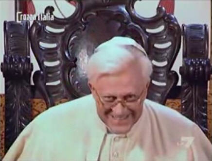 Sans doute cette méchanceté laisse-t'elle notre Pape indifférent (encore que son secrétaire Georg Gänswein ait manifesté très vivement son agacement et sa réprobation). Il a suffisamment d'humour pour cela, c'est la thèse de Luigi Accattoli, dans son blog, qui rappelle ce qu'il avait répondu sur le thème de l'humour aux journalistes bavarois en août dernier: on peut le voir ici (interview) et même entendre le rire de Benoît, sur cette courte video capturée sur ZDF (humour.swf [1 096 KB]